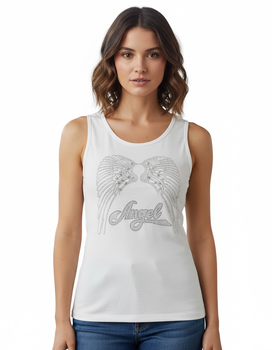 Elevate your casual style with the Angel Wing Beaded Tank. This sleeveless white top features an intricate angel wing beaded design with shimmering details, adding a heavenly touch to your look. The “Angel” script underneath the wings completes the ethereal vibe, making it a perfect choice for casual wear with a glamorous twist.