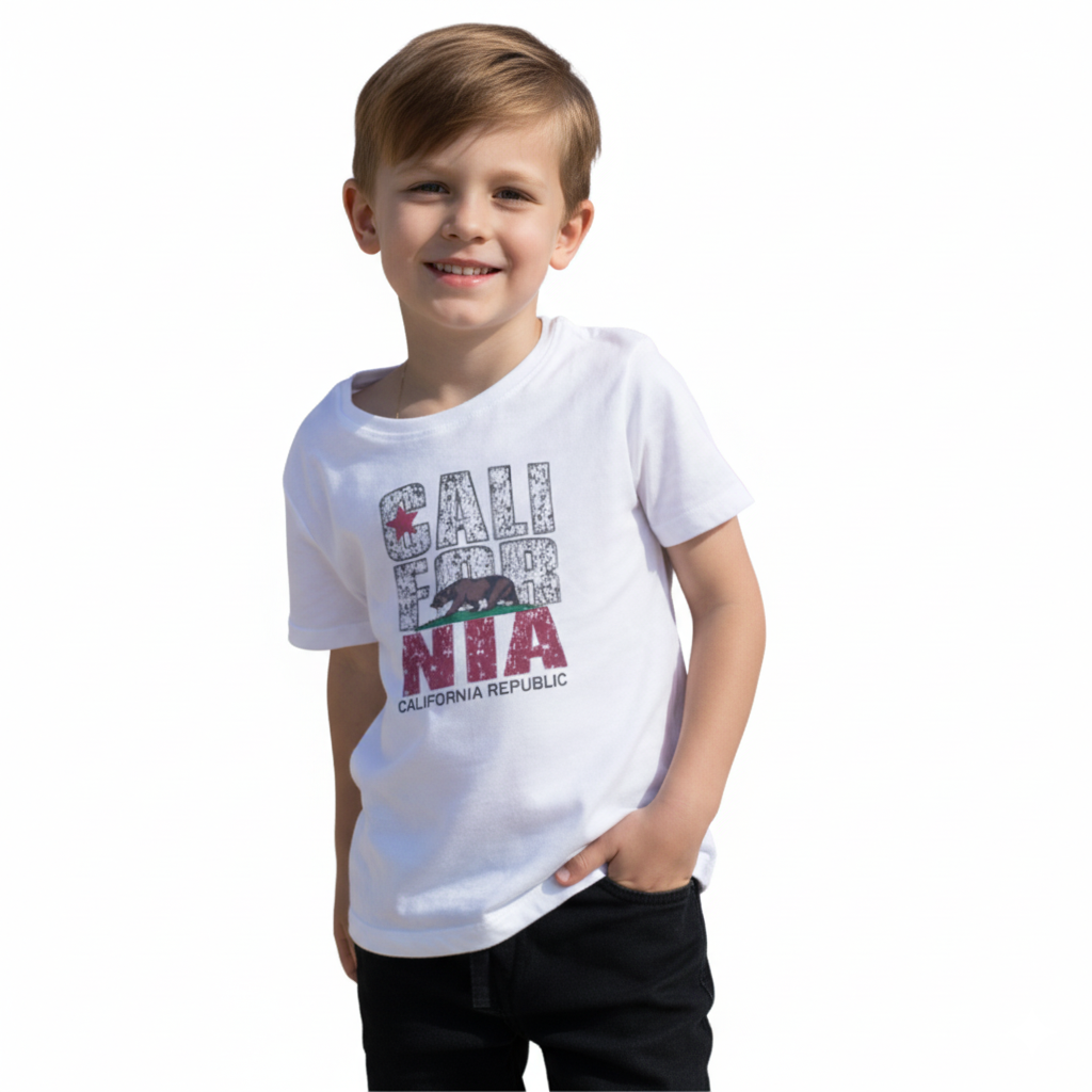 Let your child show off their West Coast pride with the California Republic kids t-shirt. This playful and bold tee features a creative “CALIFORNIA” graphic with a bear emblem, representing the iconic Golden State. It’s a cool and casual piece for everyday adventures under the sun.