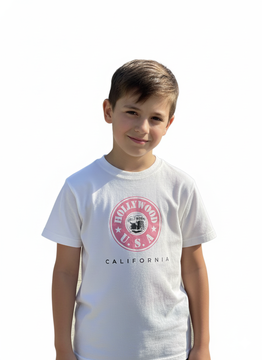 Show off some West Coast pride with this Hollywood USA kids t-shirt. Featuring a bold pink circular logo and “California” text below, this tee combines comfort with a pop of color and a touch of vintage charm. Perfect for your little trendsetter.