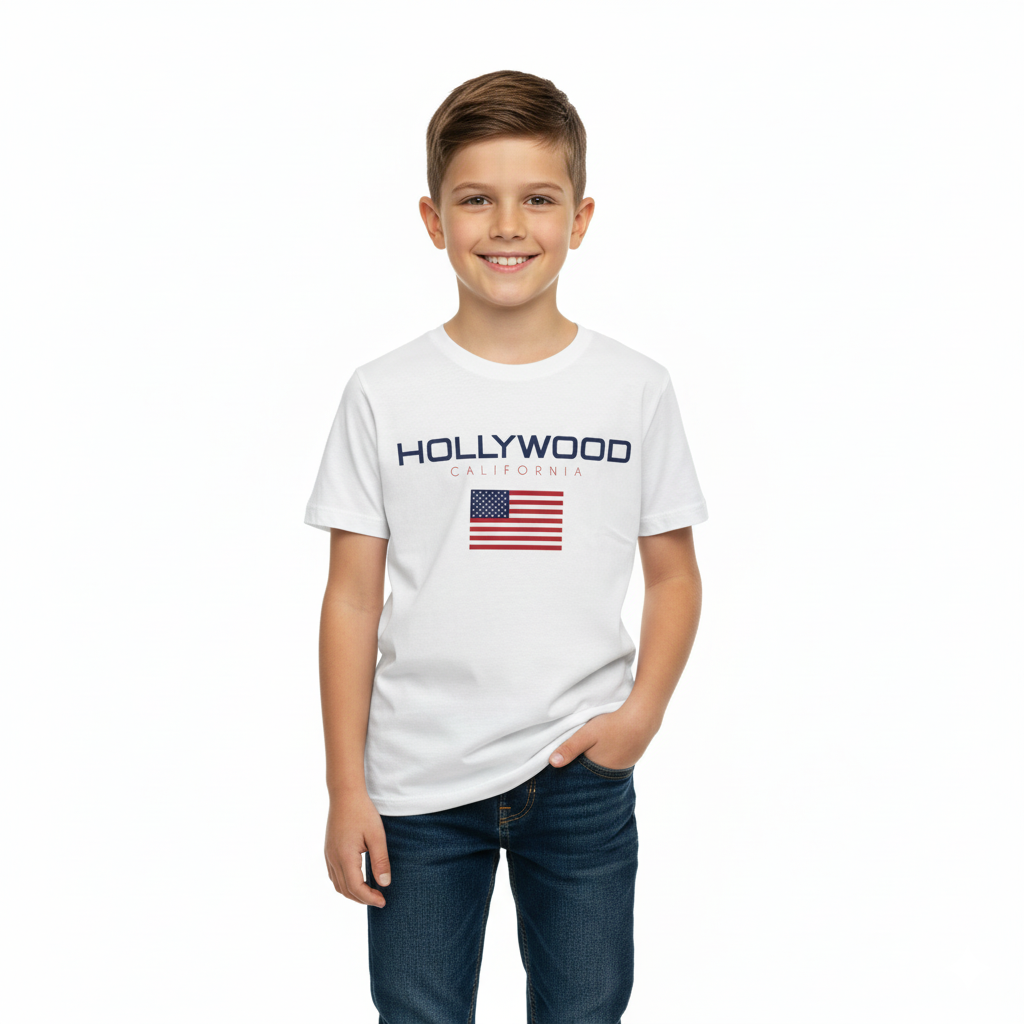 Show off a patriotic vibe with this Hollywood USA Flag kids t-shirt. Featuring a clean and bold design with the American flag under the “Hollywood” text, this shirt offers a stylish tribute to California and the USA. Great for everyday wear or holiday celebrations.