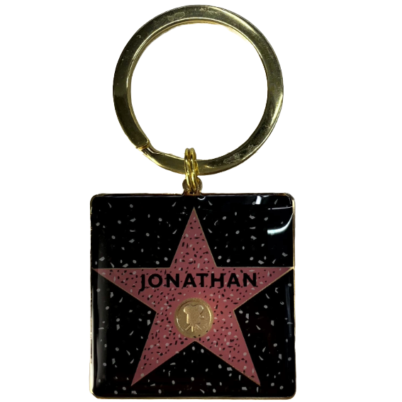 Square keychain with “JONATHAN” on a classic pink Hollywood star.