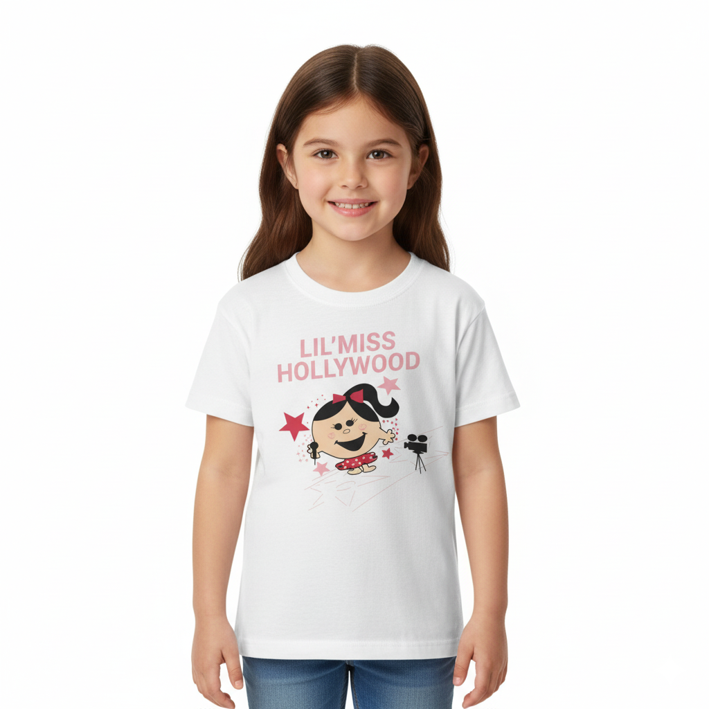 Let your little star shine in the Lil’ Miss Hollywood kids t-shirt. With an adorable illustrated character and movie-themed design, this shirt is perfect for future actresses and Hollywood dreamers. A charming and comfy tee that brings playful energy to any child’s wardrobe.